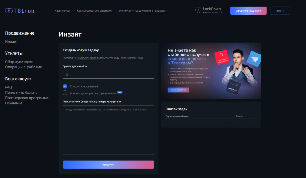 Выберите раздел для создания задач: укажите каналы конкурентов для парсинга и установите лимиты на приглашения, чтобы избежать блокировок. Например, начните с 50-100 приглашений в день. TGtron позволит настроить фильтры по активности, обеспечивая накрутку телеграм дешево и безопасно.